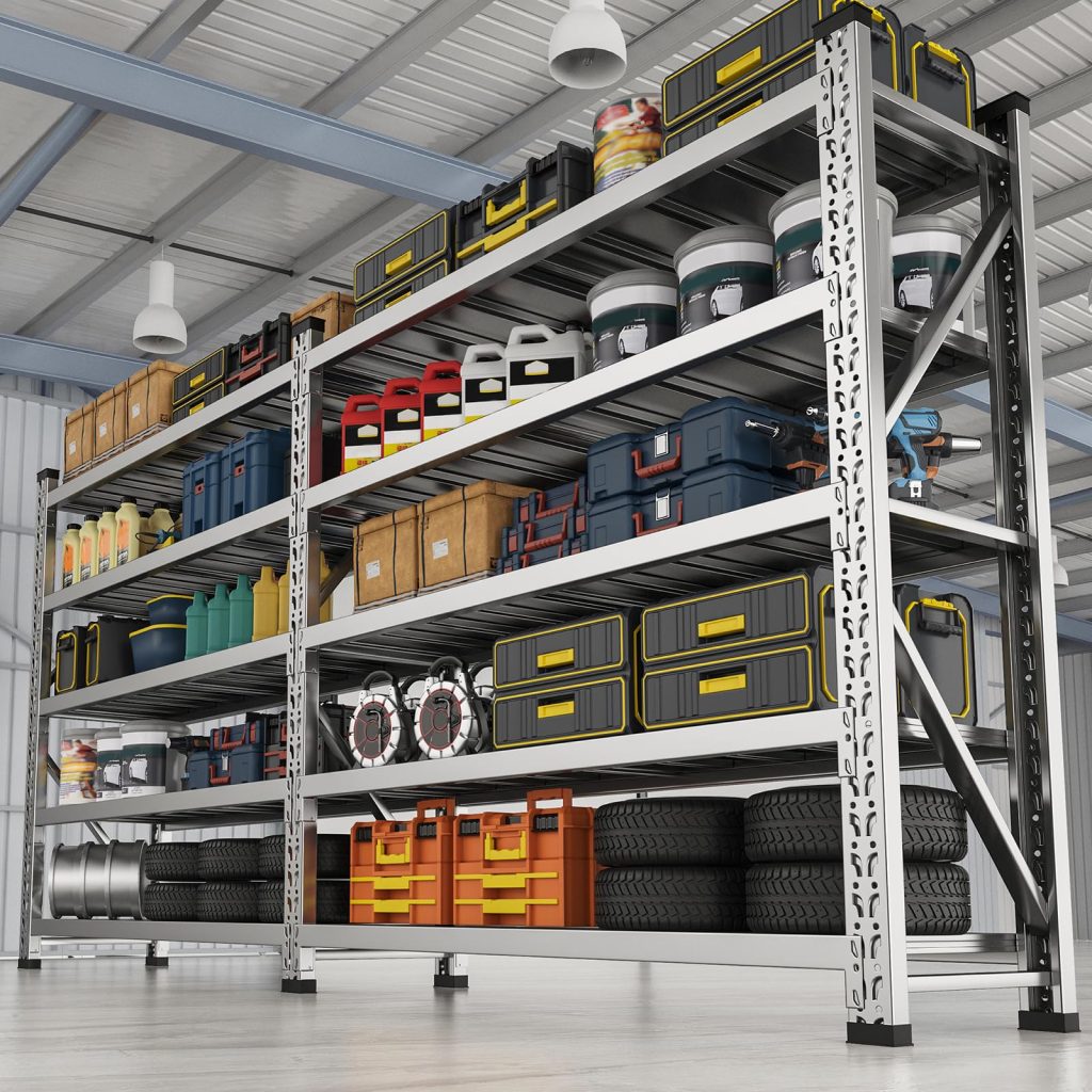 Strong, wide shelving for bulky items, ideal for warehouses and storage.